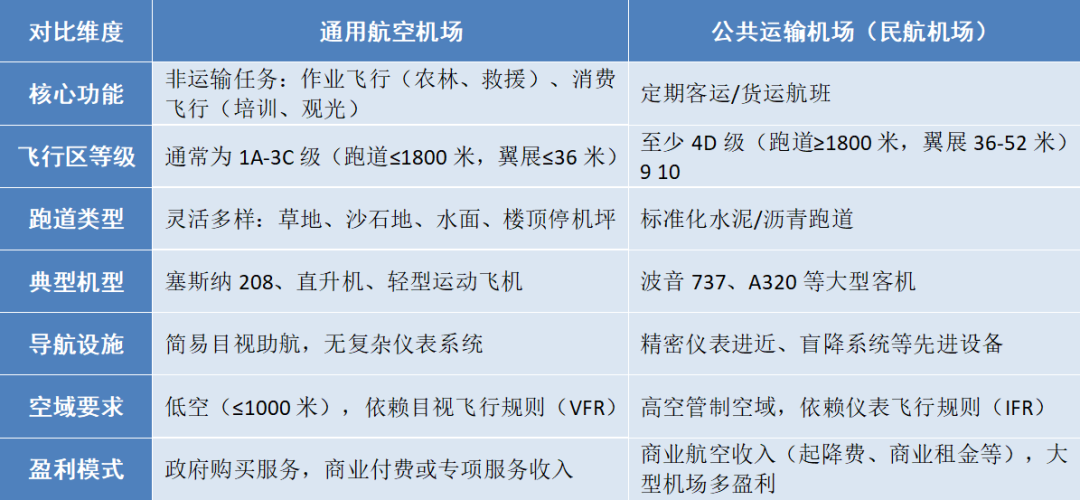 从多个维度对比通用机场与公共运输机场(经由DeepSeek整理)